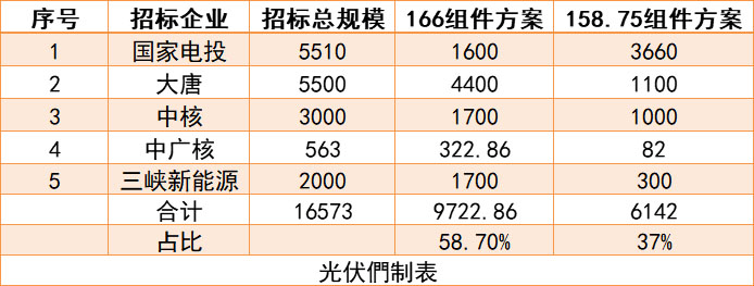 另一方面,除了上述因生產(chǎn)成本導(dǎo)致的供貨問(wèn)題之外,高效產(chǎn)能供應(yīng)能力也是下半年搶裝的一大隱憂。光伏們統(tǒng)計(jì)了五家電力央企的組件集采情況,其中166組件方案占比將近60%,加上后續(xù)的華電、華能等招標(biāo),166的占比預(yù)計(jì)將超過(guò)60%。