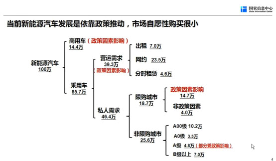 反觀私人市場,雖然也出現(xiàn)不同程度下降,但限購限行城市與雙非限城市整體的比例結(jié)構(gòu)還是比較穩(wěn)定的。把市場打開以后可以看到,新能源汽車的100萬輛銷量中:商用車里的公交、市政、物流車等,是政策拉動的重要市場;乘用車中,運營車輛占到了接近40萬輛,這也是由于政策推動,剩下私人需求購買的是46萬左右的市場;私人市場中限購城市的銷量還占大部分,非限購城市也就是20萬輛的需求,去除非限購城市中網(wǎng)約車的一部分A級車,真正市場自愿購買的需求也就不到20萬輛的市場。當然這里也有政策的功勞,因為還有新能源汽車補貼。