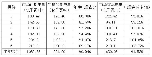 上半年市場(chǎng)計(jì)劃電量為1090億千瓦時(shí),實(shí)際完成電量1030億千瓦時(shí),電量完成率為94.53%。受突如其來的“新冠肺炎”疫情影響,1、2和4月份低于市場(chǎng)用戶計(jì)劃總用電量,5月和6月隨著國(guó)內(nèi)疫情的有效控制和國(guó)家各項(xiàng)復(fù)工復(fù)產(chǎn)政策效應(yīng)的顯現(xiàn),用電量較計(jì)劃值2~5個(gè)百分點(diǎn)增幅。上半年長(zhǎng)協(xié)電量占比均值為90.94%,高于年度計(jì)劃數(shù)據(jù),主要是受疫情影響,一季度用電需求負(fù)增長(zhǎng)和二季度增長(zhǎng)低于預(yù)期所致,2月份的數(shù)據(jù)最具有代表性,工商業(yè)春節(jié)后復(fù)工緩慢,實(shí)際用電量完成率僅為59.12%,占當(dāng)月長(zhǎng)協(xié)電量的72.36%。