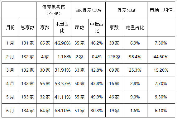 受疫情影響,上半年用電側(cè)偏差率波動(dòng)較大,總體呈現(xiàn)前高后低,尤其是2月份,當(dāng)月偏差率(絕對(duì)值)為44.6%,導(dǎo)致前六個(gè)月全市場(chǎng)平均偏差率為15.03%,扣除2月份影響,其余月份偏差率平均值為9.12%。