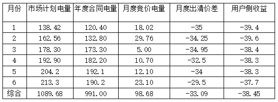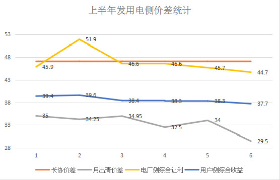 上半年月度競(jìng)價(jià)交易總電量占比不到10%,價(jià)差相對(duì)穩(wěn)定,總體上(絕對(duì)值數(shù)據(jù))呈下降態(tài)勢(shì),從1月份的-35厘/千瓦時(shí)到6月份的-29.5厘/千瓦時(shí),與市場(chǎng)預(yù)期基本一致。從上半年的數(shù)據(jù)來看,綜合長(zhǎng)協(xié)和月度競(jìng)價(jià)情況,電廠和用戶側(cè)度電價(jià)差基本上穩(wěn)定在平均值(-46.41厘/千瓦時(shí)和-38.45厘/千瓦時(shí))附近,雖然2月份電廠讓利幅度較大,超過50厘/千瓦時(shí),原因主要是電廠偏差電量考核所致,用戶側(cè)受購售電合同價(jià)格已固化價(jià)差收益,所以收益未有明顯變化。