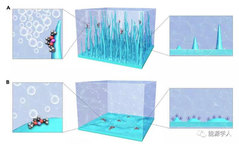 圖5 陽(yáng)離子添加劑作用示意圖。(A)不含陽(yáng)離子添加劑的電解液。電解液析氣劇烈,陽(yáng)極呈樹(shù)枝狀結(jié)構(gòu)。(B)含有陽(yáng)離子添加劑的電解液。由于靜電屏蔽效應(yīng),在一定程度上阻止了電解液析氣,陽(yáng)極呈現(xiàn)出光滑的形貌。