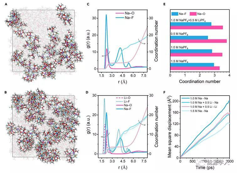 通過(guò)分子動(dòng)力學(xué)模擬進(jìn)一步探討了鋰離子對(duì)電解質(zhì)性質(zhì)的影響。為了定量分析溶劑化結(jié)構(gòu),進(jìn)行了徑向分布函數(shù)g(r)分析,總結(jié)了不同電解質(zhì)中Na+與O/F的配位數(shù)。