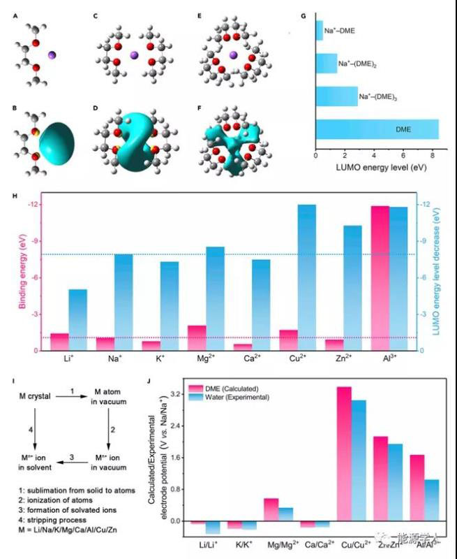 考慮到陽(yáng)離子添加劑的電極電位應(yīng)低于鈉金屬負(fù)極,作者建議使用Li+、K+和Ca2+。綜合考慮到LUMO能級(jí)的降低和結(jié)合能,Li+是最佳的候選元素。鋰離子的電極電位是-0.08 V vs Na/Na+,若添加劑的濃度比實(shí)際電池中的工作離子小得多,該電位幾乎不會(huì)變正。此外,Li+與DME分子的結(jié)合能比Na+大,不易脫溶劑化。因此,鋰離子不能在鈉金屬負(fù)極上還原。更重要的是,Li+對(duì)DME的LUMO水平降低比Na+小,可以穩(wěn)定電解質(zhì)溶液。