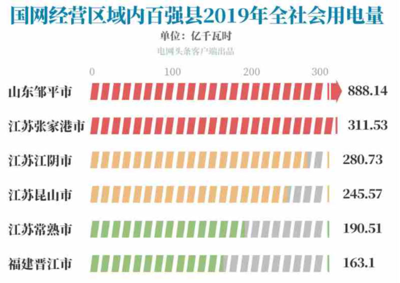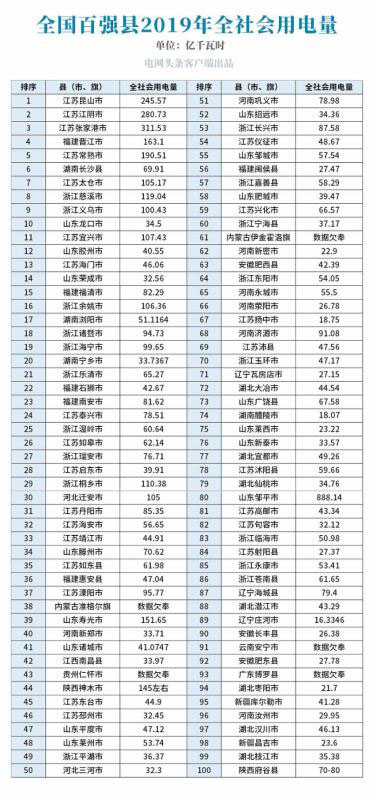 頭條君拿到這份百強縣名單,定睛一看,有94個百強縣位于國網(wǎng)經(jīng)營區(qū)域內(nèi)。他們在2019年用了多少電呢?