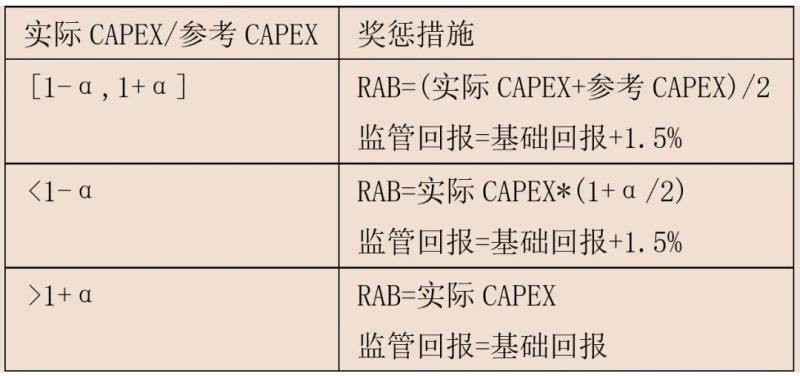 按α=10%考慮,如某一投資項(xiàng)目的決算投資額(實(shí)際CAPEX)是預(yù)算投資額(參考CAPEX)的90%-110%之間,按照決算投資額與預(yù)算投資額的平均值計(jì)入監(jiān)管資產(chǎn)(RAB),因此節(jié)約(超支)金額的50%將成為電網(wǎng)企業(yè)的獎(jiǎng)勵(lì)(懲罰),同時(shí)該部分投資額可在基礎(chǔ)回報(bào)率的基礎(chǔ)上額外享受1.5%的監(jiān)管回報(bào);如決算投資額低于預(yù)算投資額的90%,可按照決算投資額的105%計(jì)入監(jiān)管資產(chǎn),同時(shí)該部分投資額可在基礎(chǔ)回報(bào)率的基礎(chǔ)上額外享受1.5%的監(jiān)管回報(bào);如決算投資額超出預(yù)算投資額的110%,項(xiàng)目可按照實(shí)際投資額計(jì)入監(jiān)管資產(chǎn),但將無(wú)法享受額外回報(bào)。