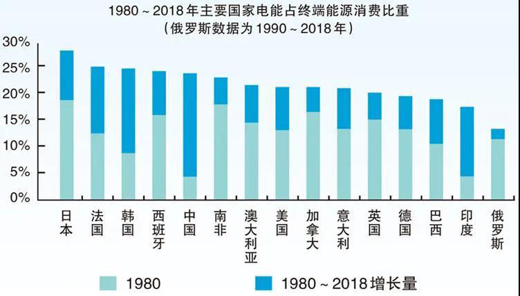 2018年,全球電能占終端能源的消費(fèi)比重為19.2%;發(fā)達(dá)國(guó)家普遍較高,中國(guó)為24%。