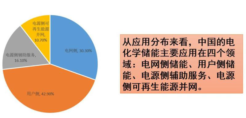 接下來是儲能技術(shù)應(yīng)用的幾個領(lǐng)域,從應(yīng)用分布來看,中國的電化學(xué)儲能主要應(yīng)用在四個領(lǐng)域:電網(wǎng)側(cè)儲能、用戶側(cè)儲能、電源側(cè)輔助服務(wù)、電源側(cè)可再生能源并網(wǎng)。