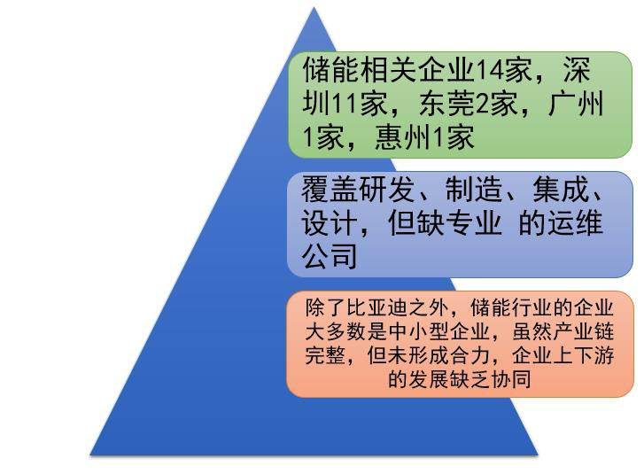 最后介紹一下廣東的儲能產(chǎn)業(yè),這也是不完全統(tǒng)計。廣東省的儲能產(chǎn)業(yè)鏈還是挺完整的,上規(guī)模的一共有十幾家,覆蓋了研發(fā)、制造、集成、設(shè)計,但是缺乏專業(yè)的運(yùn)維公司,這不僅是廣東的情況,全國的情況都是缺乏專業(yè)的運(yùn)維公司,大家重建設(shè)輕運(yùn)維,會導(dǎo)致項(xiàng)目后期收益不好。