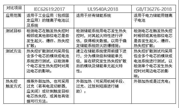 很多科研機(jī)構(gòu)以及各電池企業(yè)都致力于研究通過技術(shù)手段來規(guī)避電芯發(fā)生熱失控的誘因,并通過開發(fā)穩(wěn)定可靠的觸發(fā)方法來檢驗(yàn)發(fā)生熱失控以及熱失控蔓延時(shí)造成的危害程度。目前,國內(nèi)外包含儲(chǔ)能用電池?zé)崾Э匾蠛蜏y試方法的相關(guān)標(biāo)準(zhǔn)有IEC62619:2017, UL9540A:2018,GB/T36276-2018等。各標(biāo)準(zhǔn)對應(yīng)的應(yīng)用情景不盡相同,在技術(shù)要求、觸發(fā)熱失控方式、測試方法手段等方面存在差異。