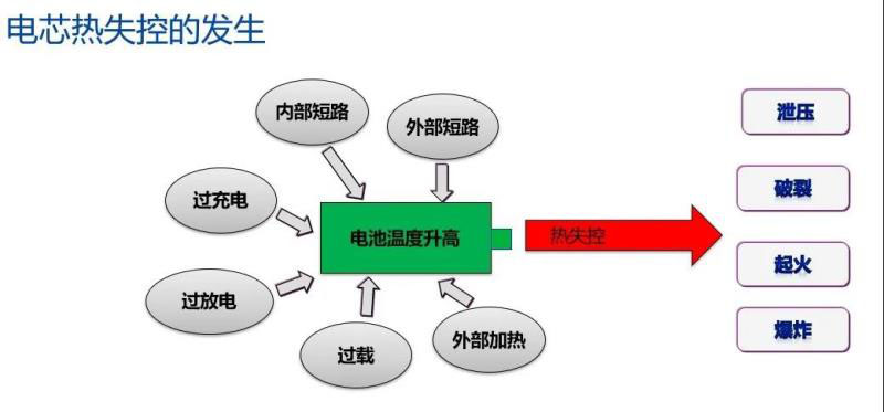 何為熱失控以及熱失控?cái)U(kuò)散?熱失控往往是由于鋰離子電池內(nèi)部短路(發(fā)生了擠壓變形、穿刺或者高溫炙烤等導(dǎo)致隔膜被破壞引發(fā)正負(fù)極短路),或者由于電池外部短路,導(dǎo)致鋰離子電池內(nèi)部短時(shí)間內(nèi)積累了大量熱量,引發(fā)正負(fù)極活性物質(zhì)和電解液等發(fā)生分解,導(dǎo)致鋰離子電池起火和爆炸,進(jìn)而蔓延擴(kuò)散。如果電池系統(tǒng)中,由于一個(gè)電芯產(chǎn)生熱失控而引發(fā)其他電芯熱失控,即為熱失控?cái)U(kuò)散。