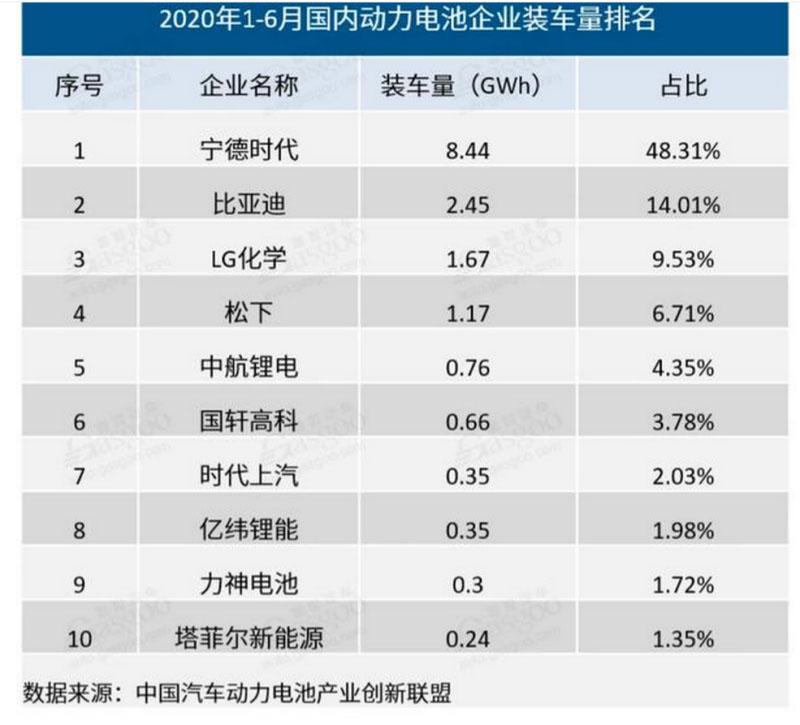 根據(jù)動力電池產(chǎn)業(yè)創(chuàng)新聯(lián)盟數(shù)據(jù),2020年上半年,裝機量Top10企業(yè)占據(jù)了動力電池93.77%的市場份額。寧德時代占比近半,達到48.31%;比亞迪占據(jù)14.01%;在動力電池“白名單”取消后,外資品牌LG化學、松下卷土重來,分別占據(jù)9.53%、6.71%的市場份額;剩余不到30%由中航鋰電、國軒高科等企業(yè)瓜分。