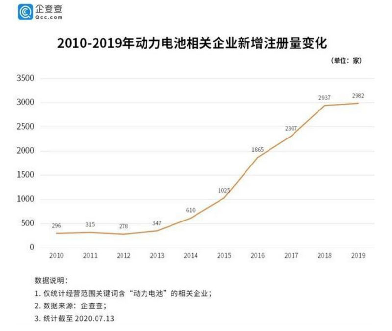 企查查數(shù)據(jù)顯示,截至2020年7月,我國動力電池相關(guān)企業(yè)共有近1.3萬家。2016年增速最快,全年新增注冊量1865家,同比增長81.95%。2018年、2019年新增注冊量均近3000家。
