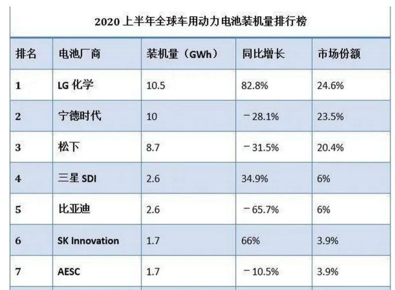 具體來看,LG化學(xué)的裝機(jī)量達(dá)到10.5 GWh,同比大漲82.8%,從而由去年同期的第4位躍升至第1位。寧德時代則以10 GWh的裝機(jī)量排名第2,市場份額為23.5%。之后是松下的8.7 GWh,市場份額為20.4%。從裝機(jī)量來看,以上三家廠商將其他企業(yè)遠(yuǎn)遠(yuǎn)甩在了后面。