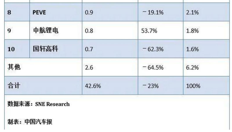 數(shù)據(jù)顯示,今年上半年,全球排行前十的電池廠商中,LG化學(xué)、三星SDI、SK Innovation和中航鋰電的電池裝機(jī)量均實現(xiàn)了同比增長,其他廠商則出現(xiàn)了不同幅度的下滑。