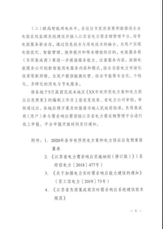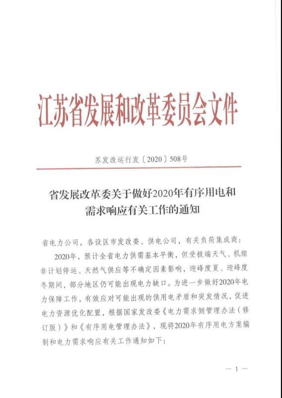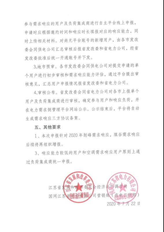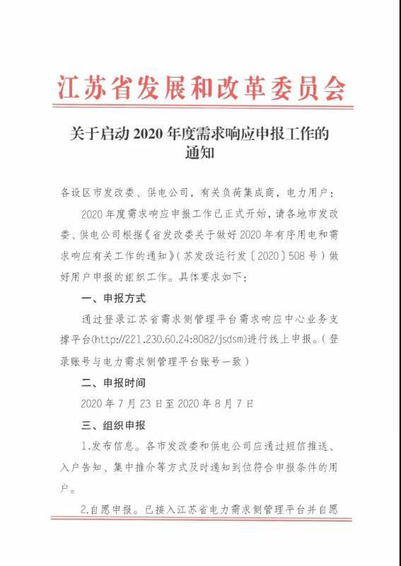 江蘇省發(fā)布了?關(guān)于啟動(dòng)2020年度需求響應(yīng)申報(bào)工作的通知?,本次申報(bào)針對(duì)2020年削峰需求響應(yīng),填谷需求響應(yīng)后續(xù)將再組織增報(bào)。響應(yīng)能力較低的用戶和空調(diào)需求響應(yīng)用戶原則上通過負(fù)荷集成統(tǒng)一申報(bào)。