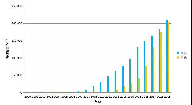 圖1 我國風(fēng)電及光伏裝機(jī)總量變化趨勢