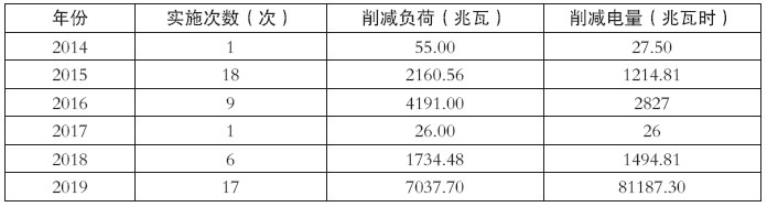 在需求響應(yīng)實(shí)施早期,實(shí)施目的主要是為了應(yīng)對(duì)夏季高峰時(shí)段電力消費(fèi)緊張狀況,最大程度削減高峰電力負(fù)荷對(duì)電網(wǎng)安全的影響,保障了民生用電和重點(diǎn)用電安全平穩(wěn)。2014~2019年度國(guó)內(nèi)開(kāi)展削峰需求響應(yīng)的情況如下表所示。