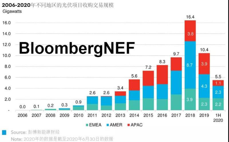 2019年在運光伏項目收購交易規(guī)模顯著低于2018年,主要因為美國市場2018年有幾宗規(guī)模較大的交易,而2019年美國光伏收購交易規(guī)模僅為2018年的一半,且歐洲市場的收購交易也出現(xiàn)放緩。2020年上半年的初步數(shù)據(jù)表明歐洲、中東和非洲地區(qū)的收購交易恢復(fù)勢頭強勁,上半年的收購交易規(guī)模已經(jīng)達到2.2GW,超過去年全年的交易規(guī)模。
