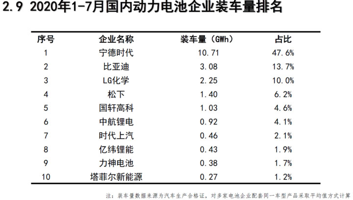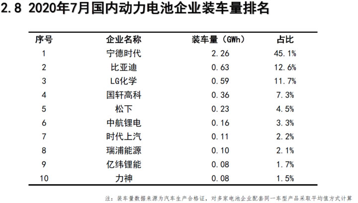 企業(yè)方面,2020年7月,我國新能源汽車市場共計(jì)45家動(dòng)力電池企業(yè)實(shí)現(xiàn)裝車配套,較6月份減少3家。排名前3家、前5家、前10家動(dòng)力電池企業(yè)動(dòng)力電池裝車量分別為3.5GWh、4.1GWh和4.6GWh,占總裝車量比分別為69.4%、81.3%和91 .9%。