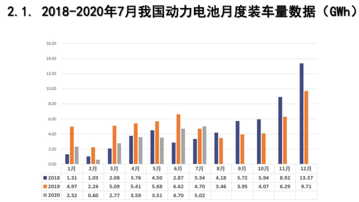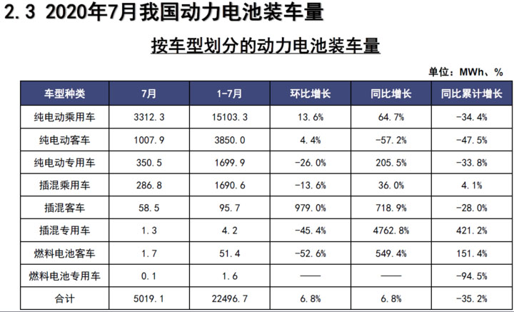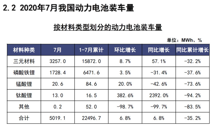 裝車量來看,2020年7月,我國動(dòng)力電池裝車量5GWh,同環(huán)比均上升6.8%。其中三元電池共計(jì)裝車量3.3GWh,同比上升57.1%,環(huán)比上升8.7%;磷酸鐵鋰電池共計(jì)裝車量1.7GWh,同比下降31.4%,環(huán)比增長3.5%。