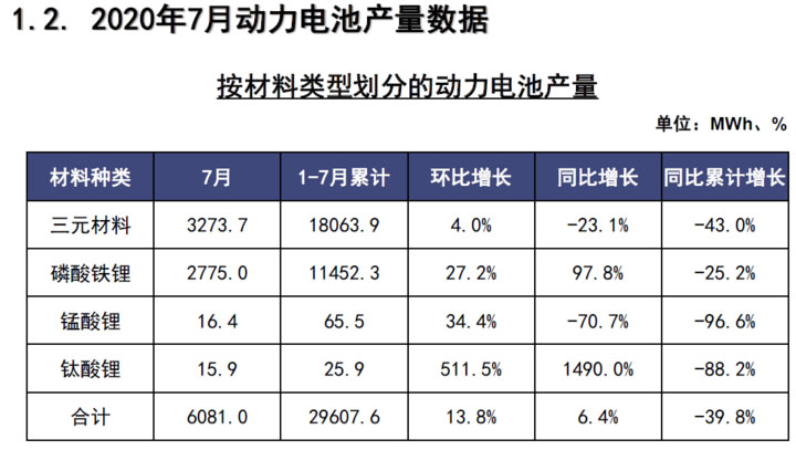 7月,我國動(dòng)力電池產(chǎn)量共計(jì)6.08GWh,同比增長6.4%,環(huán)比上升13.8%。其中三元電池產(chǎn)量3.3GWh,占總產(chǎn)量53.8%,同比下降23.1%,環(huán)比增長4%;磷酸鐵鋰電池產(chǎn)量2.8GWh,占總產(chǎn)量45.6%,同比增長97.8%,環(huán)比增長27.2%。