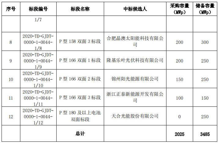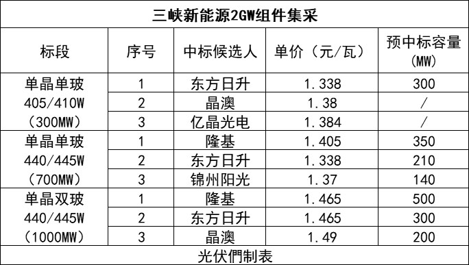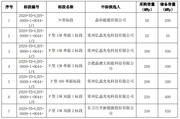 近日,國家電投、三峽新能源2020年組件集采相繼定標,包括晶科、億晶光電、晶澳、東方日升、天合光能、正泰、隆基等入圍。在國家電投5.51GW集采中,億晶光電(2.01GW)、晶澳(1GW)、東方日升(900MW)、隆基(750MW)、錦州陽光(400MW),天合光能、晶科與正泰分別中標250MW;三峽新能源2GW組件集采中,隆基預中標850MW、東方日升810MW、晶澳200MW、錦州陽光140MW。