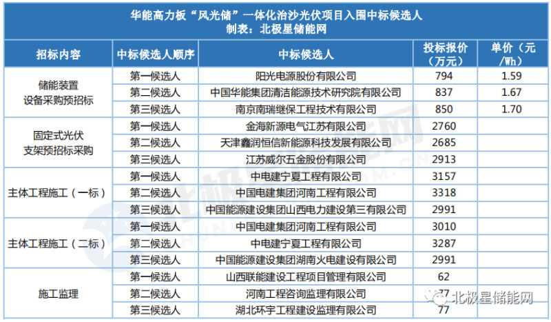 經(jīng)過前期一系列的精心準(zhǔn)備,8月12日,華能高力板“風(fēng)光儲”一體化治沙100MW光伏發(fā)電項(xiàng)目發(fā)布了儲能裝置設(shè)備采購、固定式光伏支架預(yù)招標(biāo)采購等預(yù)招標(biāo)結(jié)果,具體公布結(jié)果如下: