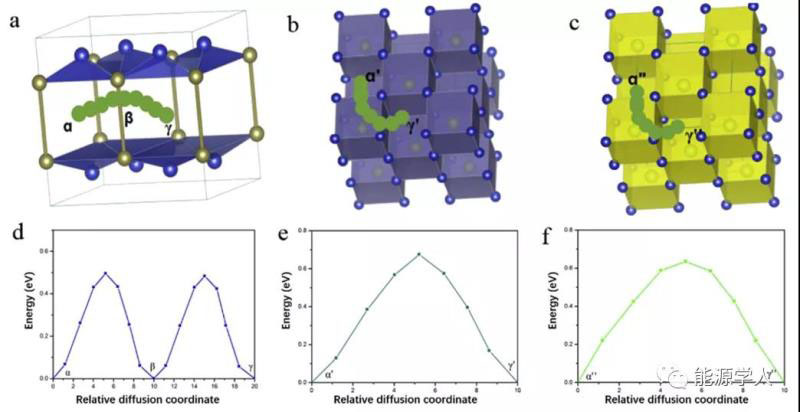 圖4 Mg2+在Cu2Te、Cu2Se、Cu2S中的擴散路徑(a、b、c)和擴散能壘(d、e、f)