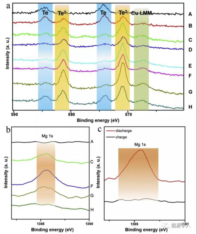圖3. 首圈循環(huán)中Te、Mg非原位XPS(a、b);循環(huán)穩(wěn)定后Mg非原位XPS(c)