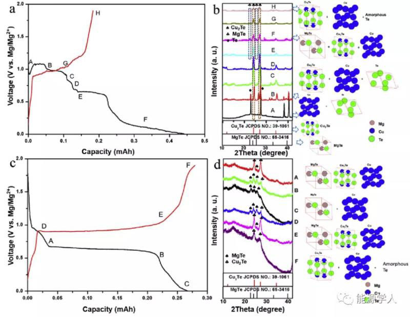要點2. 中間相Cu2Te在可逆儲鎂過程中起到了至關重要的作用,首圈放電至0.93V時,生成了Cu2Te相。在循環(huán)穩(wěn)定后,Mg、Te、Cu三種元素之間相互作用,實現鎂在正極材料中的可逆存儲。