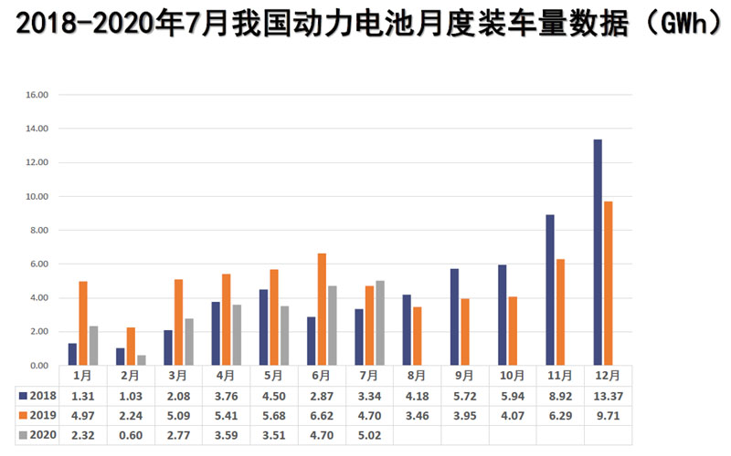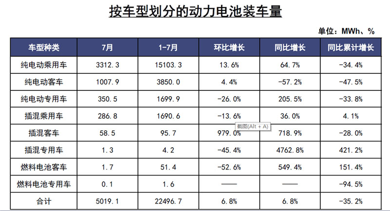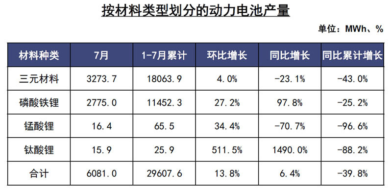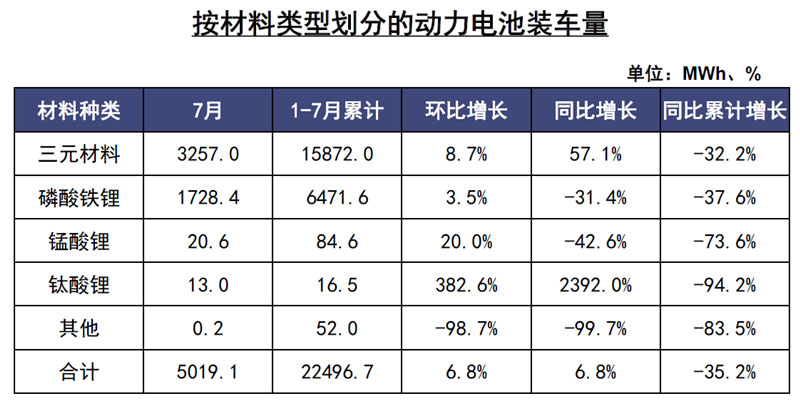 前7月,我國動(dòng)力電池裝車量累計(jì)22.5GWh,同比累計(jì)下降35.2%。其中三元電池裝車量累計(jì)15.9GWh,占總裝車量70.6%,同比累計(jì)下降32.2%;磷酸鐵鋰電池裝車量累計(jì)6.5GWh,占總裝車量28.8%,同比累計(jì)下降37.6%。
