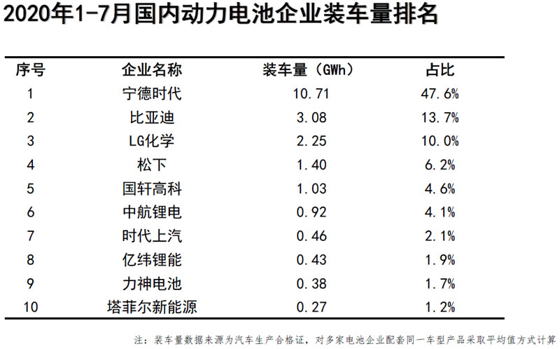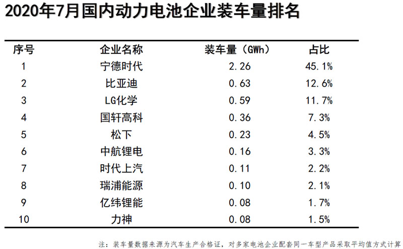 7月動(dòng)力電池企業(yè)裝車量排名中,寧德時(shí)代、比亞迪、LG化學(xué)分別以2.26GWh、0.63GWh和0.59GWh包攬前三,比亞迪超越LG化學(xué)上升至第二位。