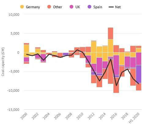 19個(gè)歐盟國(guó)家和英國(guó)已承諾,到2030年逐步淘汰燃煤發(fā)電,德國(guó)的目標(biāo)是2038年,而西班牙、波蘭、捷克、羅馬尼亞、保加利亞、斯洛文尼亞和克羅地亞這七個(gè)歐盟成員國(guó)尚未同意逐步退煤。不過(guò),雖然西班牙尚未承諾逐步淘汰煤炭,該國(guó)已于2020年6月淘汰了一半的煤炭發(fā)電機(jī)組(9.6GW中的4.8GW)。