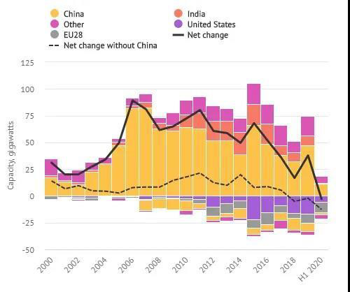 圖二:2000年至2020年上半年全球煤電裝機(jī)凈變化