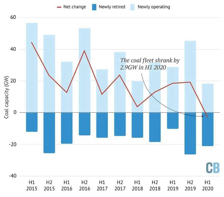 近日,全球能源監(jiān)測(cè)機(jī)構(gòu)Global Energy Monitor發(fā)布的報(bào)告顯示,上半年全球煤電裝機(jī)規(guī)模首次出現(xiàn)下滑,減少2.9GW至2047GW,這是半年期內(nèi)煤電退役產(chǎn)能首次超過(guò)投產(chǎn)產(chǎn)能。歐洲眾多電力公司加快了落后產(chǎn)能的淘汰速度,疫情影響下歐洲燃煤電廠審批量銳減,美國(guó)煤電的凈減少等都是造成這一結(jié)果的原因。