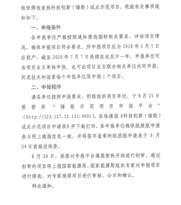 從北京昌平政府網(wǎng)獲悉:北京市發(fā)改委日前印發(fā)《關(guān)于組織申報(bào)科技創(chuàng)新(儲(chǔ)能)試點(diǎn)示范項(xiàng)目的通知》,按照國(guó)家能源局要求,在全市已投產(chǎn)的除抽水蓄能外電力儲(chǔ)能工程中組織篩選首批儲(chǔ)能試點(diǎn)示范項(xiàng)目,要求8月21日前在線申報(bào),8月20日北京發(fā)改委開(kāi)始進(jìn)行初審。
