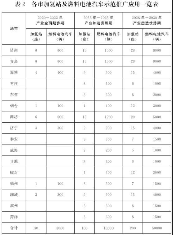 2020年到2022年,為氫能產(chǎn)業(yè)全面起步期,省域內(nèi)累計示范推廣燃料電池汽車3000輛左右;2023年到2025年,為氫能產(chǎn)業(yè)加速發(fā)展期,累計推廣燃料電池汽車10000輛;2026年到2030年,為氫能產(chǎn)業(yè)塑造優(yōu)勢期,累計推廣燃料電池汽車50000輛(詳情見下表):