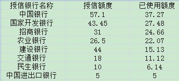 其中,據(jù)記者統(tǒng)計(jì),中國銀行共授信57.1億元,已使用額度37.27億元;國家開發(fā)銀行共授信43.45億元,已使用額度27.48億元;招商銀行共授信31億元,已使用額度24.66億元;農(nóng)業(yè)銀行共授信26.5億元,已使用額度22.07億元;建設(shè)銀行授信44億元,已使用額度15.13億元;交通銀行共授信18億元,已使用額度11.12億元;民生銀行共授信10億元,已使用額度6.14億元;中國進(jìn)出口銀行共授信5億元,已使用額度5億元。