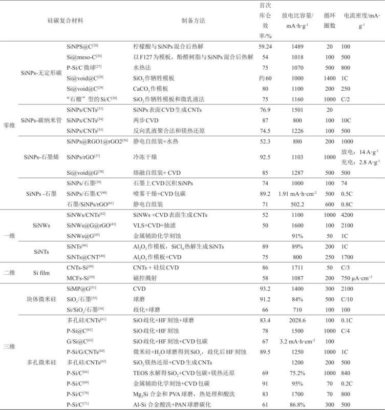 表1 典型的硅碳復(fù)合材料及其制備方法和電化學性能總結(jié)