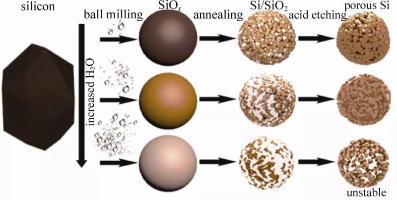 塊狀微米硅擁有高的壓實密度和體積比容量,但是由于其顆粒尺寸過大,顆粒更容易破裂粉化,離子的擴散距離也更長,導(dǎo)致庫侖效率低,容量衰減快,而納米硅材料的顆粒尺寸小,可有效緩解體積膨脹,縮短粒子的傳輸路徑。多孔微米硅的一次顆粒為納米尺寸,可以有效避免塊狀微米硅的各種缺點,而其二次顆粒的微米尺寸又能保證硅的高壓實密度和體積比容量。目前,制備多孔微米硅的方法主要有:SiOx歧化、鎂熱還原反應(yīng)、金屬輔助刻蝕法(MACE)和硅基金屬合金刻蝕等。