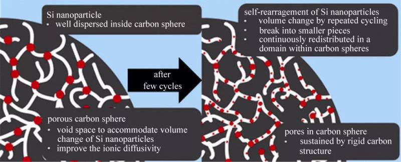 從目前研究來看,將硅顆粒尺寸降低到納米量級能有效抑制硅在循環(huán)過程中因體積膨脹而造成的粉化和電脫離,改善循環(huán)性能。但是納米材料具有非常大的比表面積,與電解液接觸時易發(fā)生不可逆副反應(yīng)消耗大量鋰鹽形成SEI膜,導(dǎo)致庫侖效率降低和容量衰減。尤其是當硅含量較高時,上述問題將更加嚴重。通過納/微結(jié)構(gòu)設(shè)計,降低納米硅/碳的比表面積,并緩解硅的電化學應(yīng)力,有望得到高首效和長循環(huán)的硅/碳復(fù)合材料。