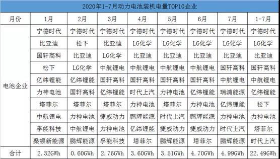 具體來看,2020年1-7月國內(nèi)動(dòng)力電池裝機(jī)電量排名主要有以下變化: