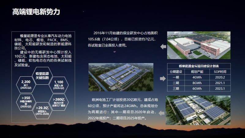 蜂巢能源的前身是長城汽車動(dòng)力電池事業(yè)部,自2012年起開展電芯的預(yù)研工作,2018年2月獨(dú)立為蜂巢能源。公司總部位于江蘇常州。是一家專業(yè)從事汽車動(dòng)力電池材料、電芯、模組、PACK、BMS、儲(chǔ)能、太陽能研發(fā)和制造的新能源高科技公司。