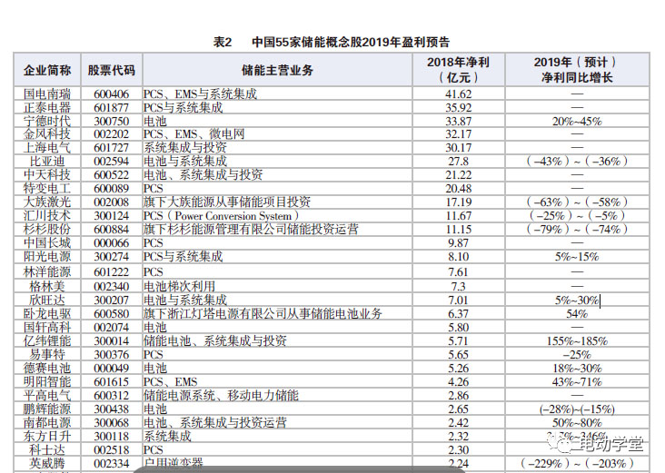 55家,截至2020年2月19日,共有35家相關(guān)上市公司發(fā)布了2019年度業(yè)績(jī)預(yù)告。從公告內(nèi)容來(lái)看,31家實(shí)現(xiàn)盈利,4家處于虧損狀態(tài);盈利預(yù)增22家,盈利下滑13家,預(yù)增比例超過六成,整體業(yè)績(jī)?nèi)匀豁g性十足。其中,寧德時(shí)代預(yù)計(jì)實(shí)現(xiàn)盈利40.64億元至49.11億元,位居榜首;億緯鋰能預(yù)計(jì)實(shí)現(xiàn)凈利14.55至16.27億元,陽(yáng)光電源預(yù)計(jì)實(shí)現(xiàn)凈利8.5至9.3億元,欣旺達(dá)預(yù)計(jì)實(shí)現(xiàn)凈利7.37至9.11億元,東方日升預(yù)計(jì)實(shí)現(xiàn)凈利9.7億元至10.4億元,同樣引人注目。另一方面,英威騰、美都能源、珈偉新能仍然大幅虧損,ST猛獅、堅(jiān)瑞沃能雖然實(shí)現(xiàn)扭虧,但未來(lái)業(yè)務(wù)發(fā)展是否具有可持續(xù)性,尚有待觀察。具體見表2。目前,儲(chǔ)能仍處于商業(yè)化前夜的培育階段,雖然儲(chǔ)能業(yè)務(wù)目前占各上市公司業(yè)務(wù)比例仍然較低,但母公司的盈利情況在一定程度上決定了未來(lái)其在儲(chǔ)能板塊的拓展力度和發(fā)展方向,供參考。