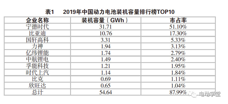2019年,中國(guó)動(dòng)力電池裝機(jī)量約62.2GWh。寧德時(shí)代繼續(xù)拿下2019年全球動(dòng)力電池出貨量冠軍,完成“三連冠”。其中,寧德時(shí)代國(guó)內(nèi)市場(chǎng)份額占比超過50%,寧德時(shí)代、比亞迪二者合計(jì)的市場(chǎng)份額接近70%,寡頭趨勢(shì)加劇,見表1。
