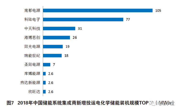 2018年,中國(guó)新增投運(yùn)的電化學(xué)儲(chǔ)能項(xiàng)目中,裝機(jī)規(guī)模排名前十位的儲(chǔ)能系統(tǒng)集成商,依次為:南都電源、科陸電子、中天科技、海博思創(chuàng)、陽(yáng)光電源、瑞能世紀(jì)、圣陽(yáng)電源、欣旺達(dá)、煦達(dá)新能源和庫(kù)博能源,見圖7。