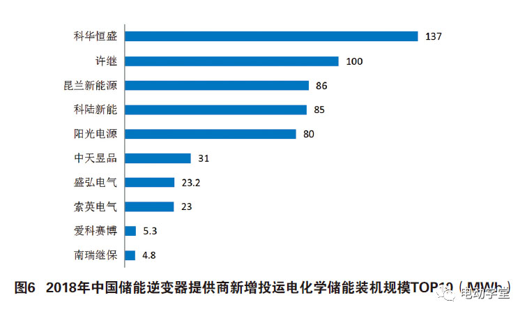 2018年,中國(guó)新增投運(yùn)的電化學(xué)儲(chǔ)能項(xiàng)目中,裝機(jī)規(guī)模排名前十位的儲(chǔ)能逆變器提供商,依次為:科華恒盛、許繼、昆蘭新能源、科陸新能、陽(yáng)光電源、中天昱品、盛弘電氣、索英電氣、愛科賽博和南瑞繼保,見圖6。