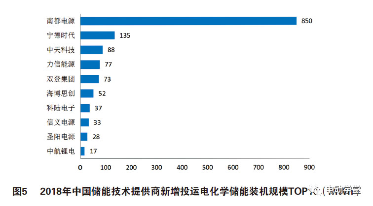 2018年,中國(guó)新增投運(yùn)的電化學(xué)儲(chǔ)能項(xiàng)目中,裝機(jī)規(guī)模排名前十位的儲(chǔ)能技術(shù)提供商,依次為:南都電源、寧德時(shí)代、中天科技、力信能源、雙登集團(tuán)、海博思創(chuàng)、科陸電子、信義電源、圣陽(yáng)電源和中航鋰電,見圖5。
