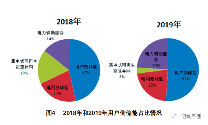 從電化學(xué)儲(chǔ)能應(yīng)用來(lái)看,2019年用戶側(cè)儲(chǔ)能裝機(jī)812MW,占比51%,較上年增長(zhǎng)4個(gè)百分點(diǎn);電網(wǎng)側(cè)儲(chǔ)能占比22%,較上年增長(zhǎng)1個(gè)百分點(diǎn);輔助服務(wù)占比24%,較上年增長(zhǎng)10個(gè)百分點(diǎn);集中式可再生能源并網(wǎng)占3%,較上年降低15個(gè)百分點(diǎn)。在裝機(jī)容量占比方面,用戶側(cè)(工商業(yè)削峰填谷、需求側(cè)響應(yīng)等)因高的小時(shí)率要求,容量裝機(jī)獨(dú)占鰲頭,見圖4。